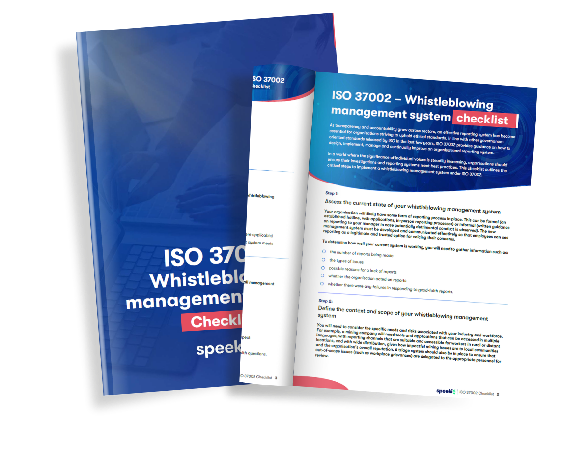 Speeki’s ISO 37002 checklist provides the critical steps to build and strengthen your organisation’s whistleblowing management system, ensuring alignment with best practices for effective report handling and fostering a culture of transparency and trust.